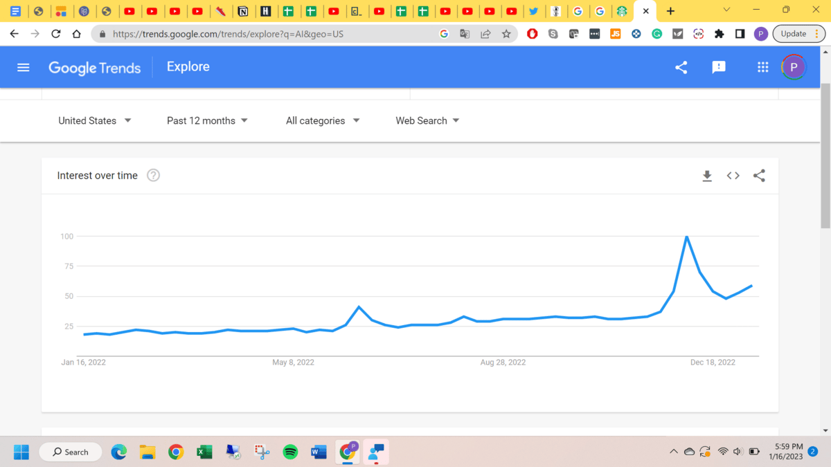 Other than the excessive number of tabs open on my computer, a key takeaway is a large spike in interest did coincide with the release of ChatGPT to the public. AI has officially seeped into society’s mainstream consciousness.
